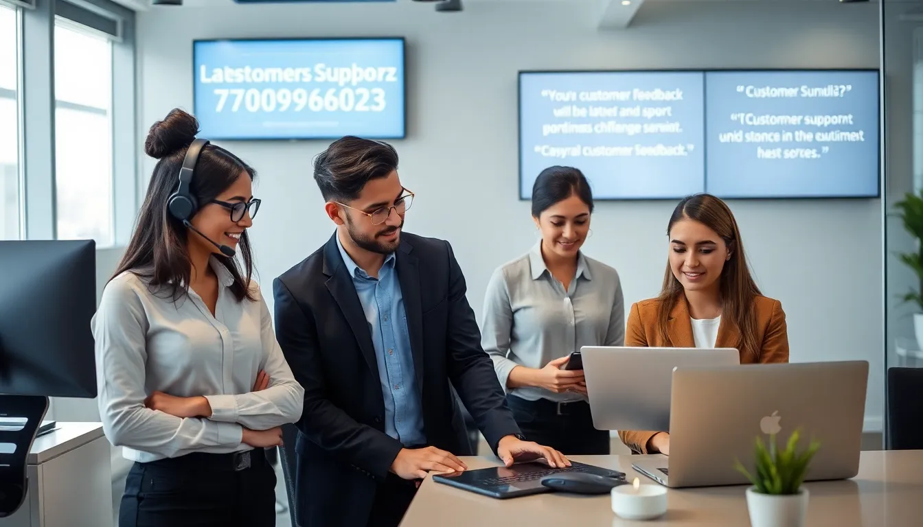 customer support team assisting clients in a modern office.
